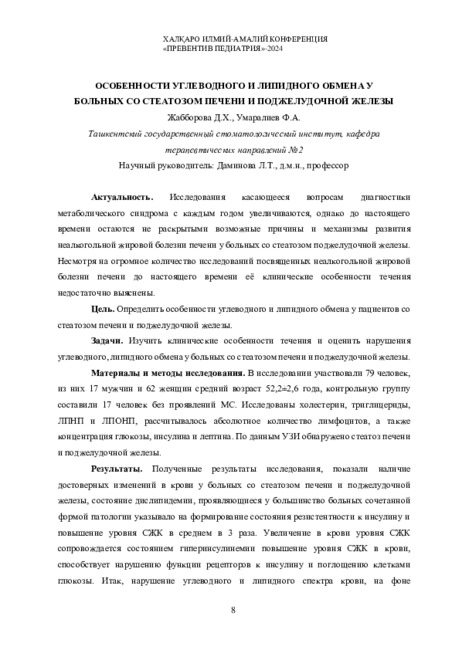 Жабборова, Д., Умаралиев, Ф., & Даминова, Л. (2024). Особенности углеводного и липидного обмена у больных со стеатозом печени и поджелудочной железы . Профилактическая педиатрия, 1(1), 8–9. извлечено от https://inlibrary.uz/index.php/preventive-pediatrics/article/view/34205