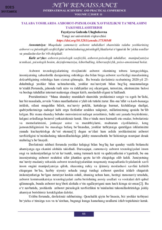 TALABA YOSHLARDA AXBOROT-PSIXOLOGIK XAVFSIZLIKNI TA’MINLASHNI