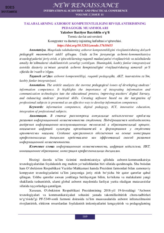 Maqolada talabalarning axborot kompetentliligini rivojlantirishning dolzarb pedagogik muammolari tahlil qilingan. Unda ta’lim jarayoniga axborot-kommunikatsiya texnologiyalarini joriy etish, o‘qituvchilarning raqamli madaniyatini rivojlantirish va talabalarda amaliy ko‘nikmalarni shakllantirish zarurligi yoritilgan. Shuningdek, kasbiy fanlar integratsiyasi asosida dasturiy ta’minot yaratish axborot kompetentligini rivojlantirishning samarali yo‘li sifatida ko‘rsatib o‘tilgan.