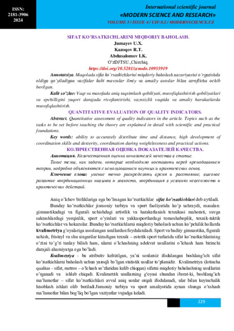 Jumayev, U., Kazoqov, R., & Abdusalomov, I. (2024). QUANTITATIVE EVALUATION OF QUALITY INDICATORS. Modern Science and Research, 3(2), 229–240. Retrieved from https://inlibrary.uz/index.php/science-research/article/view/30746