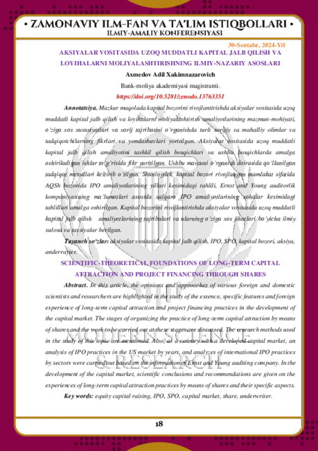 In this article, the opinions and approaches of various foreign and domestic scientists and researchers are highlighted in the study of the essence, specific features and foreign experience of long-term capital attraction and project financing practices in the development of the capital market. The stages of organizing the practice of long-term capital attraction by means of shares and the work to be carried out at these stages are discussed. The research methods used in the study of this topic are mentioned. Also, as a country with a developed capital market, an analysis of IPO practices in the US market by years, and analyzes of international IPO practices by sectors were carried out based on the information of Ernst and Young auditing company. In the development of the capital market, scientific conclusions and recommendations are given on the experiences of long-term capital attraction practices by means of shares and their specific aspects.