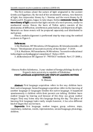 Olimova, N. (2022). First language acquisition and steps of learning mother tongue . Результаты научных исследований в условиях пандемии (COVID-19), 1(06), 186–189. извлечено от https://inlibrary.uz/index.php/scientific-research-covid-19/article/view/8638