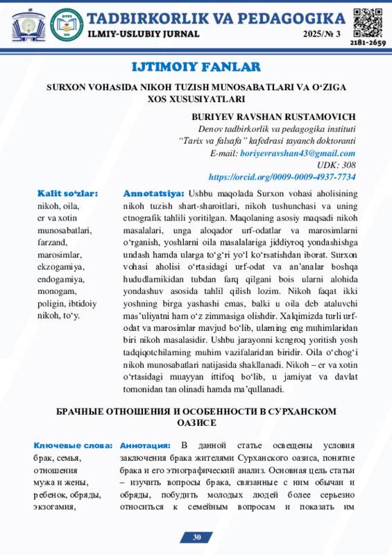 В данной статье освещены условия заключения брака жителями Сурханского оазиса, понятие брака и его этнографический анализ. Основная цель статьи – изучить вопросы брака, связанные с ним обычаи и обряды, побудить молодых людей более серьезно относиться к семейным вопросам и показать им правильный путь. Поскольку обычаи и традиции среди населения Сурханского оазиса коренным образом отличаются от обычаев и традиций других регионов, их необходимо анализировать на основе особого подхода. Брак - это не только совместное проживание двух молодых людей, но и принятие на себя ответственности, называемой семьей. В нашем народе существуют различные обычаи и обряды, одним из самых важных из которых является вопрос брака. Более широкое освещение этого процесса является одной из важных задач молодых исследователей. Семейный очаг формируется в результате брачных отношений. Брак - это определенный союз между мужем и женой, признаваемый и одобряемый обществом и государством.