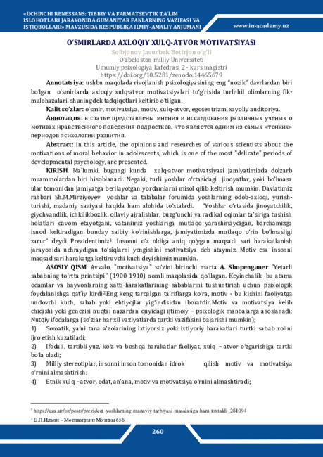 Степень внедрения и экономическая эффективность: Материалы диссертации используются в деятельности махаллинских комитетов Навбахорского и Конимсхского районов Навоийского вилоята, при проведении лекций, семинаров и практических занятий по курсам “Этнопсихология”, “Психология межличностных отношений, “Социальная психология” для студентов Национального университета Узбекистана.