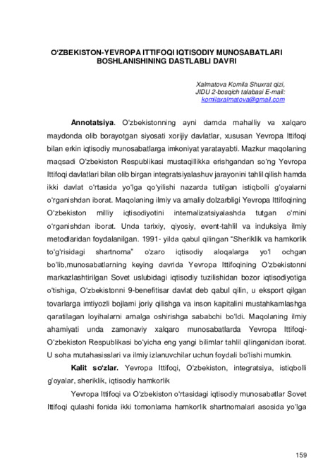 В годы независимости наша страна стала полноправным членом таких международных экономических интеграционных структур как Содружество независимых государств, Шанхайская организация содружества и добро совестно выполняла условия договоров и Меморандумов, заключенных с ними, а также ведет последовательное сотрудничество с государствами международными организациями на основе своих национальных интересов. В этом направлении в целях реализации мер, указанных в третьем направлении Стратегия действий «Дальнейшее развитие и либерализация экономики», направленная на стремительное развитие нашей страны, в частности обеспечение устойчивости национальной валюты и цен, поэтапное внедрение современных рыночных механизмов регулирования валюты, расширение доходной базы местных бюджетов, расширение внешнеэкономических связей, внедрение современных технологий для производства экспорт ориентированной продукции и материалов, развитие транспортно-логистической инфраструктуры, предпринимательства, а также стремительное развитие повышения инвестиционной привлекательности для иностранных инвесторов, является еще одним подтверждением того, что данная научная работа отвечает сегодняшним требованиям.