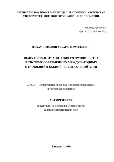 Цель работы: комплексный анализ проблем становления ШОС и перспектив её развития в системе современных международных отношений в Южной и Центральной Азии в контексте национальных интересов Республики Узбекистан.