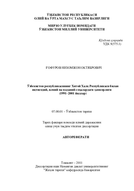 Цель работы: Научное изучение и анализ сотрудничества между Республикой Узбекистан и Китайской Народной Республикой в сфере экономики, науки и культуры.