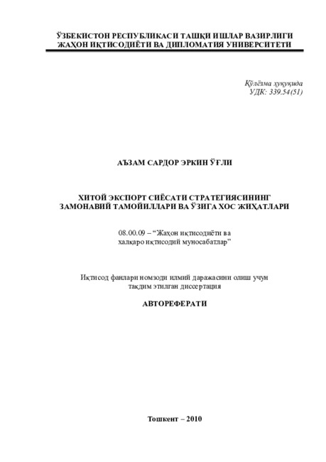 Цель работы: изучение современных тенденций и особенностей стратегии экспортной политики Китая, разработка возможностей применения позитивного опыта в условиях Узбекистана, а также, определение мер для стабильного и взаимовыгодного развития торговых отношений между двумя странами.