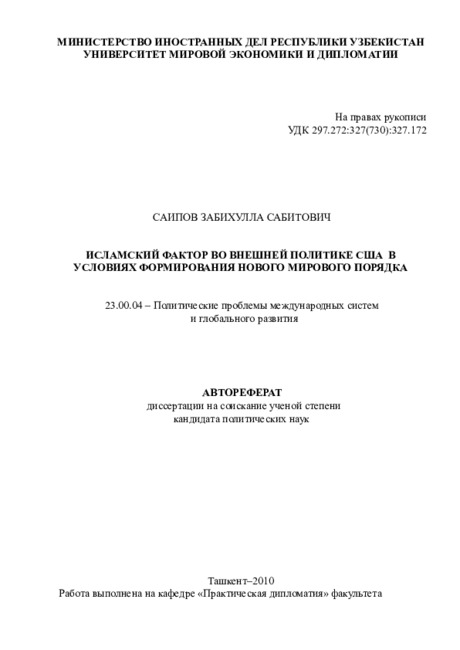 Цель работы: комплексное изучение подходов становления исламского фактора в качестве одного из приоритетных направлений во внешней политике США в условиях формирования нового мирового порядка, особенно после событий 11 сентября 2001 г., и разработка практических рекомендаций по укреплению национальной безопасности Республики Узбекистан.