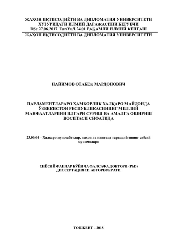 В рамках диссертационного исследования сформированы и целый ряд других теоретических и практических заключений, которые, в целом, служат развитию международного межпарламентского сотрудничества Республики Узбекистан в продвижении национальных интересов на международной арене.