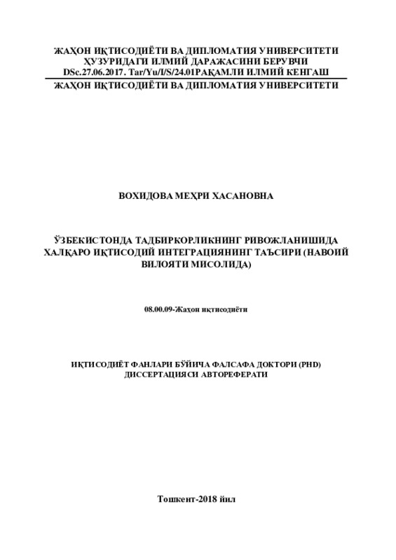Цель исследования заключается в разработке научно обоснованных предложений и рекомендаций, направленных на совершенствование предпринимательского процесса в Узбекистане в условиях международной экономической интеграции.