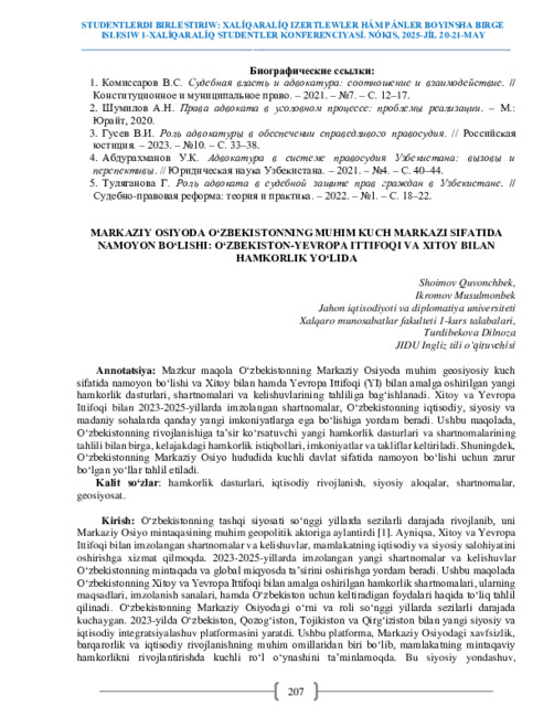 Практическая значимость: результаты исследования могут быть использованы при разработке информационно-аналитических документов Министерства иностранных дел Республики Узбекистан, Института стратегических и межрегиональных исследований при Президенте Республики Узбекистан.