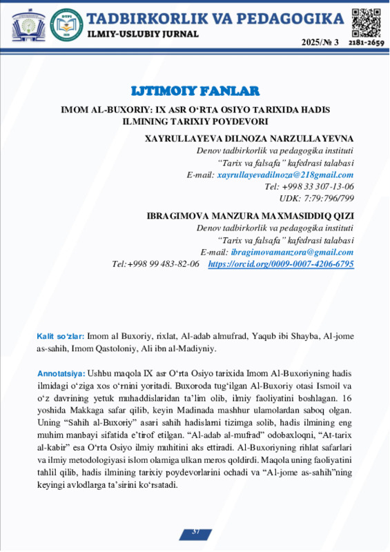 Данная статья освещает уникальную роль Имама Аль-Бухари в развитии науки хадисов в истории Средней Азии IX века. Родившийся в Бухаре Аль-Бухари получил образование под влиянием своего отца Исмаила и выдающихся мухаддисов своего времени. В 16 лет он отправился в Мекку, а затем в Медину, где учился у известных улемов. Его труд «Сахих аль-Бухари» признан важнейшим источником науки хадисов, систематизирующим достоверные хадисы. «Аль-адаб аль-муфрад» отражает вопросы этики, а «Ат-тарих аль-кабир» – научную среду Средней Азии. Путешествия (рихлят) и методология Аль-Бухари оставили огромное наследие исламскому миру. Статья анализирует его деятельность, раскрывает исторические основы науки хадисов и влияние демонстрирует влияние «Аль-джами ас-сахих» на последующие поколения.