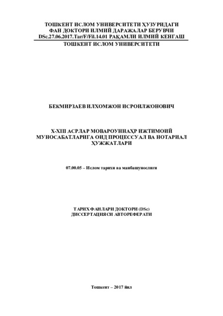 В результате научных изысканий, проведенных в рамках докторской диссертации по теме «Процессуальные и нотариальные акты социальных отношений Маверауннахра Х-ХШ веков», были представлены следующие выводы:
