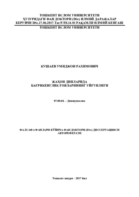 Актуальность и востребованность темы диссертации. Укрепление в мире международного, межнационального, межконфессионального сотрудничества и солидарности во многом непосредственно зависит от эффективного внедрения принципов толерантности в жизнь общества. В последние годы в глобальном масштабе разворачиваются процессы, обусловленные религиозным фактором, и они отличаются сложностями и противоречиями, а иногда сопровождаются кровавыми столкновениями. Это означает, что формирование и укрепление взаимоотношений между представителями разных религий в духе терпимости, уважения, внимания и сотрудничества является объективной исторической необходимостью. Поэтому в нашей стране принципы «обеспечение безопасности, межнационального согласия и религиозной толерантности, осуществление взвешенной, взаимовыгодной и конструктивной внешней политики» определены как стратегические задачи, а также Президентом Республики Узбекистан Ш.М.Мирзиёевым на уровне ООП были выдвинуты вперед практические рекомендации по принятии специальной резолюции Генеральной Ассамблеи «Просвещение и религиозная толерантность», которая «... призвана содействовать утверждению толерантности и взаимного уважения, обеспечению религиозной свободы, защите прав верующих, недопущению их дискриминации»1.