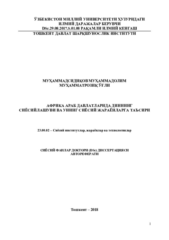 Политический анализ проблем, связанных с ролью ислама в социально-политических процессах арабских стран Африки, проблемы «современного исламизма», «политизации и радикализации ислама», «религиозного фундаментализма», а также изучение узбекскими и зарубежными авторами уровня влияния внутренних и внешних факторов на данный процесс предоставит возможность прояснить некоторые подходы и сделать следующие общие выводы: