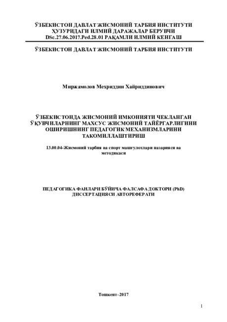 Актуальность и востребованность темы диссертации. По данным Всемирной организации здравоохранения в мире насчитывается более 600 миллионов людей с инвалидностью. С наступлением XXI века такой человек проживает в каждой 10-ой семье мира. По статистическим данным в Узбекистане среди слоев, нуждающихся в социальной защите населения, состоит на учете более 800000 инвалидов. В развитых странах мира в среднем 10% населения имеют стойкую инвалидность. Одним из эффективных средств реабилитации и социализации людей с ограниченными возможностями здоровья является адаптивная физическая культура и спорт, что требует проведения исследований по разработке оптимальной системы планирования учебных и тренировочных занятий.