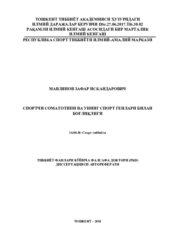 Актуальность и востребованность темы диссертации. Современный спорт в мировом масштабе характеризуется яркой конкурентоспособностью и ставит своей важнейшей задачей формирование научно-теоретического базы для максимально быстрого и успешного достижения пика физической подготовленности спортсменов. Выполнение такой задачи создает необходимость проведения исследований на спортсменах с высоко обусловленными генетическими, медико-биологическими и медикопсихологическими данными. Это доказывает необходимость проведения непрерывных и глубоких научно-прикладных исследований, связанных с ростом спортивной успешности и результативности во всех видах спорта. Особое значение для достижения высоких результатов в спорте имеет отбор одаренных и перспективных спортсменов. Ряд антропометрических показателей, в частности, тотальные размеры и пропорции тела, соматотип, существенно влияющие на физическую работоспособность, спортивную деятельность и выбор спортивной специализации, имеют высокую наследственную обусловленность, которая, наряду с психологическими, физиологическими и биохимическими факторами, создает возможность определения перспективности спортсменов.
