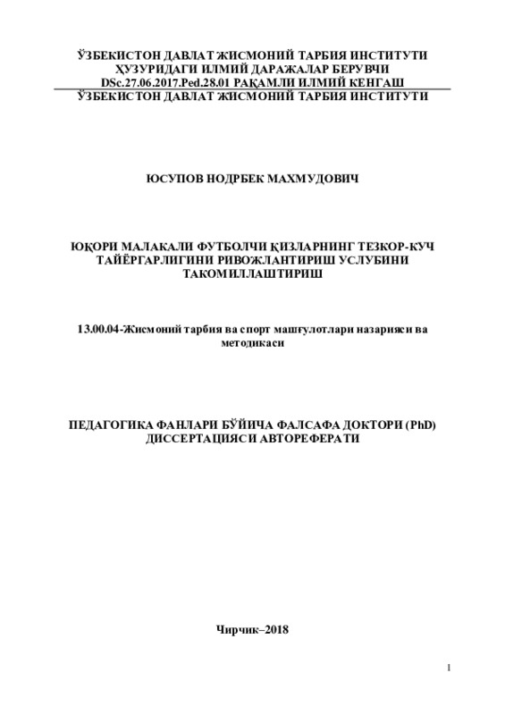 В целях создания эффективной системы отбора и обучения перспективного резерва для национальных сборных команд и професиональных клубов, Республике имеет особое значение1. Специалисты в своих научно-исследовательских работах, придерживаются точки зрения, что повышение скоростно-силовой подготовленности является одной из стержневых основ подготовки спортсменок высокой квалификации по футболу. В последние годы в Узбекистане большое значение придается развитию женского спорта, в том числе и женского футбола Вопросы, связанные с особенностями тренировки женщин, появились с момента их первого участия в различных спортивных соревнованиях. Несмотря на то что отечественными и зарубежными учеными, тренерами, педагогами высказано много предложений, направленных на дальнейшее улучшение тренировочного процесса и повышение результативности спортсменок, почти не уделяется внимания специфике подготовки женщин в том или ином виде спорта.
