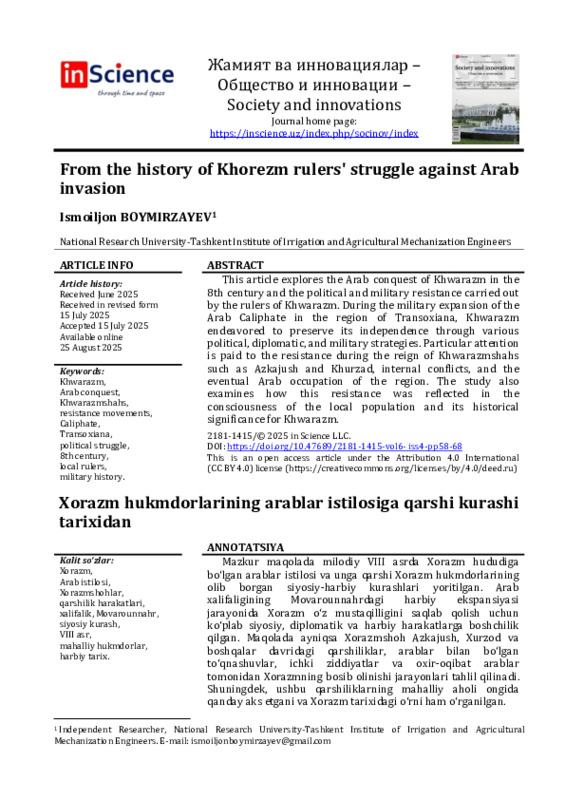 Mazkur maqolada milodiy VIII asrda Xorazm hududiga