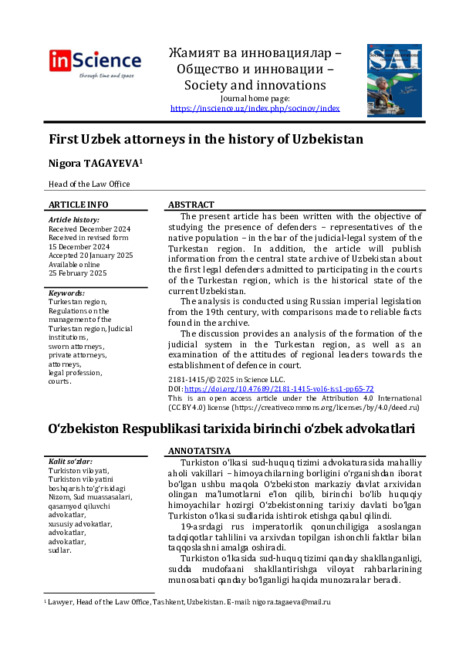 Тагаева, Н. (2025). Первые узбекские адвокаты в истории адвокатуры Узбекистана. Общество и инновации, 6(1), 65–72. https://doi.org/10.47689/2181-1415-vol6-iss1-pp65-72