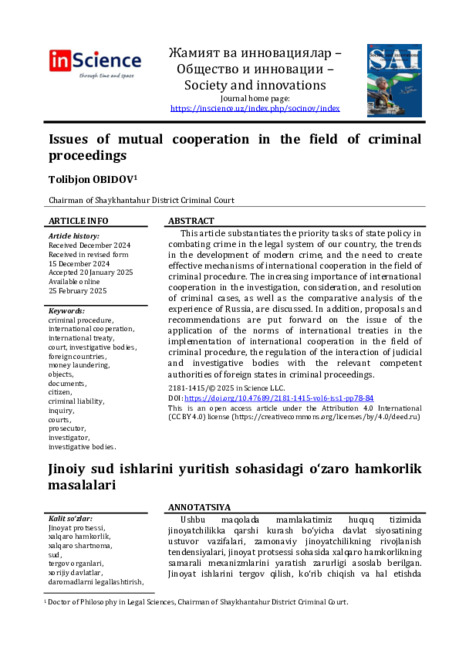 Обидов T. (2025). Вопросы взаимного сотрудничества в области уголовного судопроизводства. Общество и инновации, 6(1), 78–84. https://doi.org/10.47689/2181-1415-vol6-iss1-pp78-84