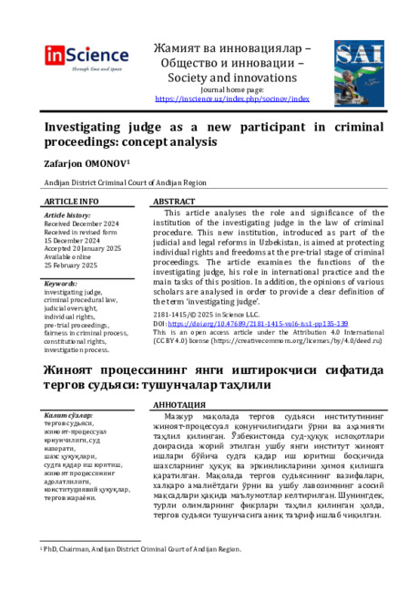Омонов, З. (2025). Следственный судья как новый участник уголовного процесса: анализ понятий . Общество и инновации, 6(1), 135–139. https://doi.org/10.47689/2181-1415-vol6-iss1-pp135-139