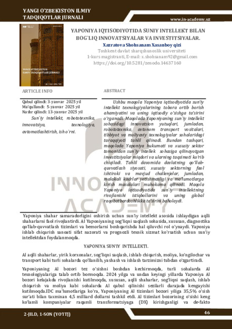 Ushbu maqola Yaponiya iqtisodiyotida sun'iy intellekt texnologiyalarining tobora ortib borish ahamiyatini va uning iqtisodiy o'sishga ta'sirini o'rganadi. Maqolada Yaponiyaning sun`iy intellekt sohasidagi innovatsion yutuqlari, jumladan, robototexnika, avtonom transport vositalari, tibbiyot va moliyaviy texnologiyalar sohalaridagi taraqqiyoti tahlil qilinadi. Bundan tashqari, maqolada Yaponiya hukumati va xususiy sektor tomonidan sun`iy intellek  sohasiga qilinayotgan investitsiyalar miqdori va ularning taqsimoti ko'rib chiqiladi. Tahlil davomida davlatning qo'llab-quvvatlash siyosati, xususiy sektorning faol ishtiroki va mavjud challenjelar, jumladan, malakali kadrlar yetishmasligi va ma'lumotlarga kirish masalalari muhokama qilinadi. Maqola Yaponiya iqtisodiyotida sun`iy intellektning rivojlanishi istiqbollarini va uning global raqobatbardoshlikka ta'sirini baholaydi.