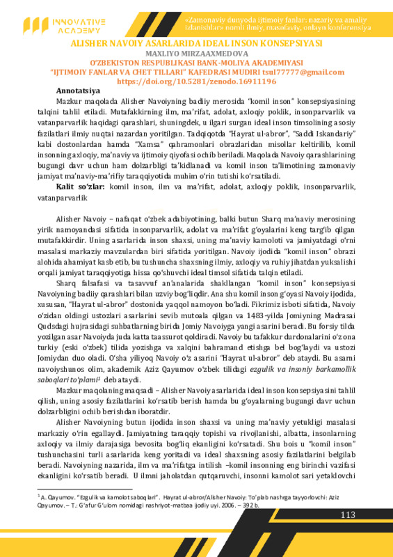 MIRZAAXMEDOVA, M. . (2025). ALISHER NAVOIY ASARLARIDA IDEAL INSON KONSEPSIYASI. Общественные науки в современном мире: теоретические и практические исследования, 4(19), 113–116. Retrieved from https://inlibrary.uz/index.php/zdif/article/view/135288