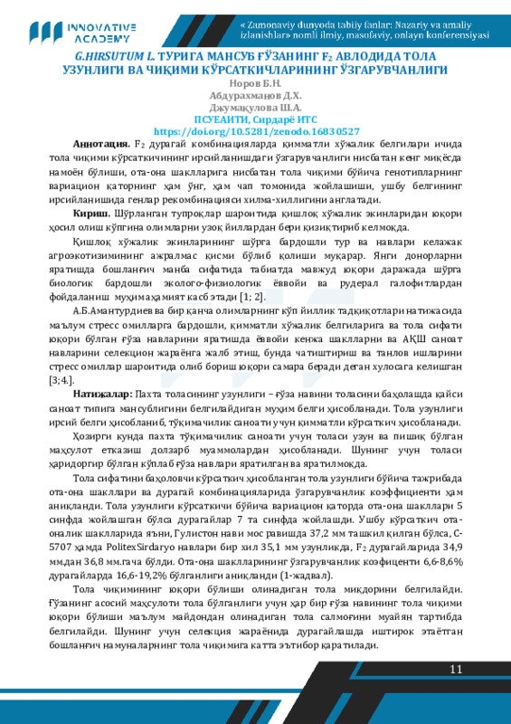 G.HIRSUTUM L. ТУРИГА МАНСУБ ҒЎЗАНИНГ F2 АВЛОДИДА ТОЛА УЗУНЛИГИ ВА ЧИҚИМИ КЎРСАТКИЧЛАРИНИНГ ЎЗГАРУВЧАНЛИГИ