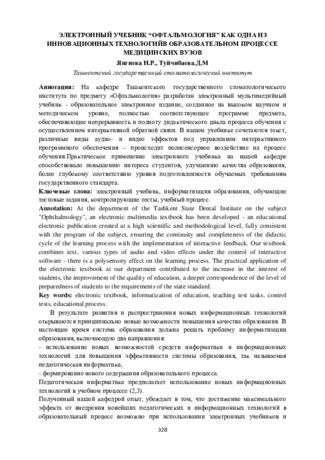 At  the  department  of  the  Tashkent  State  Dental  Institute  on  the  subject "Ophthalmology",  an  electronic  multimedia  textbook  has  been  developed  -  an  educational electronic publication created at a high scientific and methodological level, fully consistent with  the  program  of  the  subject,  ensuring  the  continuity  and  completeness  of  the  didactic cycle of the learning process with the implementation of interactive feedback. Our textbook combines  text,  various  types  of  audio  and  video  effects  under  the  control  of  interactive software - there is a polysensory effect on the learning process. The practical application of the  electronic  textbook  at  our  department  contributed  to  the  increase  in  the  interest  of students, the improvement of the quality of education, a deeper correspondence of the level of preparedness of students to the requirements of the state standard.