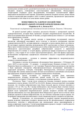 В  данной  научной  работе  изучались  результаты  больных  с  центральной  серозной хориоретинопатией,  которым  было  проведено  лазерное  микроимпульсное  воздействие.  В наше исследование было включено 39 человек, которых наблюдали в течение от 1 до 6 месяцев после проведенного лечения.  Введение.  По  данным  многих  авторов  и  проведённых  исследований,  имеется множество  заболеваний  макулярной  части  сетчатки,  в  частности  центральная  серозная хориоретинопатия (ЦСХ), которые приводят к снижению остроты зрения, вплоть до слепоты. До настоящего времени причины возникновения ЦСХ окончательно не были установлены. При остром течении возникает идиопатическая отслойка нейроэпителия. Около в 80% случаев наблюдается  самостоятельная  резорбция  субретинальной  жидкости  и  прилегания нейроэпителия.  В  отличии  от  острой  формы,  хроническая  форма  встречается  во  взрослом возрасте, у лиц старше 45 лет и имеет двухсторонний процесс. Для этой формы характерно возникновение  необратимых  атрофических  изменений  в  макуле  и  нарушения  зрительных функций.