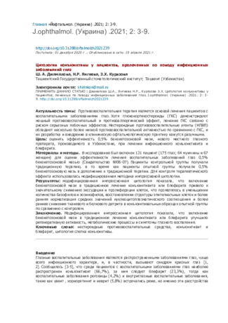 Актуальность темы:  Противовоспалительная терапия является основой лечения пациентов с воспалительными  заболеваниями  глаз. Хотя  глюкокортикостероиды  (ГКС)  демонстрируют мощный  противовоспалительный  и  противоаллергический  эффект,  лечение  ГКС  связано  с риском  серьезных  побочных  эффектов. Нестероидные  противовоспалительные  агенты  (НПВП) обладают несколько более низкой противовоспалительной активностью по сравнению с ГКС, и их разработка и внедрение в клиническую офтальмологическую практику кажутся разумными. Цель:  оценить  эффективность  0,5%  бензкетозоновой  мази,  нового  местного  глазного препарата,  производимого  в  Узбекистане,  при  лечении  инфекционного  конъюнктивита  и блефарита. Материалы и методы.  В исследование был включен 131 пациент (175 глаз; 64 мужчины и 67 женщин)  для  оценки  эффективности  лечения  воспалительных  заболеваний  глаз  0,5% бензкетозоновой  мазью  (Свидетельство  №06-07). Пациенты  контрольной  группы  получали традиционную  терапию,  в  то  время  как  пациенты  опытной  группы  получали  0,5% бензкетозоновую мазь в дополнение к традиционной терапии. Для контроля терапевтического эффекта использовалась модифицированная методика импрессивной цитологии.  Результаты:  модифицированная  импрессионная  цитология  показала,  что  включение бензкетозоновой  мази  в  традиционное  лечение  конъюнктивита  или  блефарита  привело  к значительному снижению экссудации и пролиферации клеток, что проявлялось в уменьшении количества базофилов и эозинофилов, восстановлении структуры эпителиальных клеток и более ранняя  нормализация  средних  значений  нуклеоцитоплазматического  соотношения  и  более раннее снижение тканевого и белкового детрита в конъюнктивальных образцах опытной группы по сравнению с контролем. Заключение.  Модифицированная  импрессионная  цитология  показала,  что  включение бензкетозоновой  мази  в  традиционное  лечение  конъюнктивита  или  блефарита  улучшило регенеративную активность, метаболические процессы и симптомы глазного воспаления.