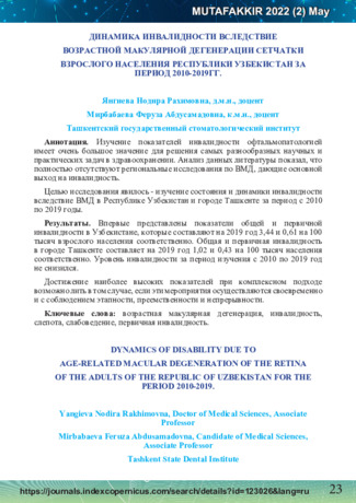 Изучение  показателей  инвалидности  офтальмопатологией имеет очень большое значение для решения самых разнообразных научных и практических задач в здравоохранении. Анализ данных литературы показал, что полностью отсутствуют региональные исследования по ВМД, дающие основной выход на инвалидность.Целью исследования явилось - изучение состояния и динамики инвалидности вследствие ВМД в Республике Узбекистан и городе Ташкенте за период с 2010 по 2019 годы. Результаты.  Впервые  представлены  показатели  общей  и  первичной инвалидности в Узбекистане, которые составляют на 2019 год 3,44 и 0,61 на 100 тысяч взрослого населения соответственно. Общая и первичная инвалидность в городе Ташкенте составляет на 2019 год 1,02 и 0,43 на 100 тысяч населения соответственно. Уровень инвалидности за период изучения с 2010 по 2019 год не снизился.Достижение  наиболее  высоких  показателей  при  комплексном  подходе возможно лить в том случае, если эти мероприятия осуществляются своевременно и с соблюдением этапности, преемственности и непрерывности.