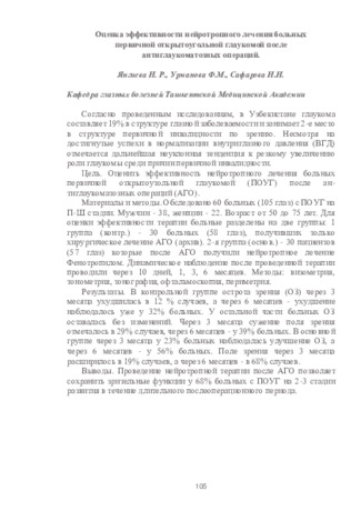 Оценка эффективности нейротропного лечения больных первичной открытоугольной глаукомой после антиглаукоматозных операций.