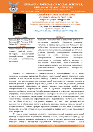 Расулова, З., & Расулова, Ш. (2023). Устный и письменный перевод: взаимосвязанное обучение . in Library, 1(1), 105–109. извлечено от https://www.inlibrary.uz/index.php/archive/article/view/20456