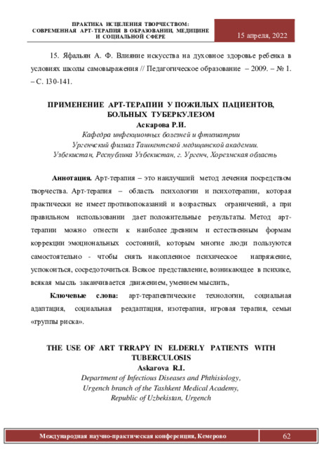 Askarova Р. (2022). The use of art trrapy in elderly patients with tuberculosis . in Library, 22(2), 62–67. Retrieved from https://www.inlibrary.uz/index.php/archive/article/view/22046