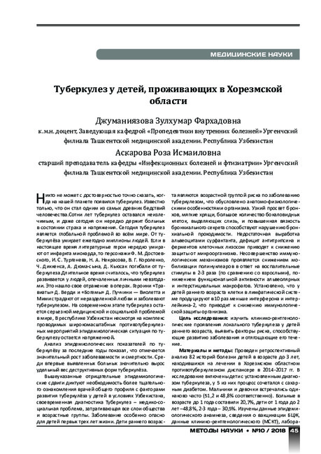 Аскарова, Р., & Джуманиязова, З. (2023). Туберкулез у детей, проживающих в Хорезмской области. in Library, 18(4), 45–46. извлечено от https://inlibrary.uz/index.php/archive/article/view/22164