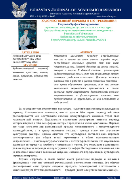 Rasulova З. (2023). Badiiy tarjima va unga qo‘yiladigan talablar. in Library, 1(2), 147–151. Retrieved from https://inlibrary.uz/index.php/archive/article/view/24189