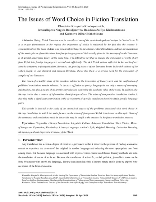 Today, Uzbek literature can be considered one of the most developed and unique in Central Asia. It is a unique phenomenon in the region, the uniqueness of which is explained by the fact that the country is geographically in the heart of Asia, and genetically belongs to the Islamic cultural traditions. Indeed, the translation of the masterpieces of our literature into foreign languages and their worthy place in the treasury of world literature is of special importance today. At the same time, it is difficult to say that at present the translation of works of art from Uzbek into foreign languages is carried out sufficiently. The rich Uzbek culture reflected in the works of art remains a mystery to foreign readers. However, the growing interest of our literature lovers in the rich culture of the Uzbek people, in our classical and modern literature, shows that there is a serious need for the translation of samples of our literature. The issues of scientific study of the problems related to the translation of literary texts and the verification of published translations remain relevant. In the texts of fiction or poetry, language is not only a means of conveying information, but also a means of its artistic reproduction, conveying the aesthetic value of the work. In addition, the literary text is also a source of information about foreign culture. The value of comparative translation studies is that they make a significant contribution to the development of specific translation theories within specific language pairs.