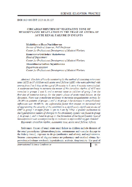 Muhitdinova , H. ., Hamrayeva , G. ., & Alauatdinova , G. . (2024). Circadian rhythm of vegetative tone of hemodynamic regulation in the phase of anuria of acute renal failure in infants. in Library, 1(2), 91–99. Retrieved from https://www.inlibrary.uz/index.php/archive/article/view/36894