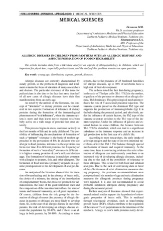 • В статье включены данные литературного обзора по аспектам изучения клинических проявлений аллергических заболеваний у детей, рожденных от матерей, страдающих аллергической патологии ,которые имеют важное значение у медиков особенно у педиатров, а также изучения этой проблемы остается открытым вопросом