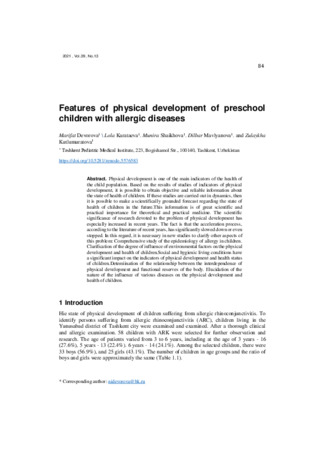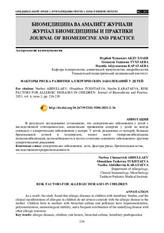 • Нукусский филиал Ташкентского педиатрического медицинского института В последние десятилетия отмечается значительное увеличение распространенности аллергии среди детей в большинстве стран мира. Наблюдения многих ученых и клиницистов показали, что часто встречаемымиизпатологиями у детей являются бронхиальная астма,атипический дерматит иаллергопатологии. В данной работе отражены аспекты этих патологических процессов на основе литературного анализа.