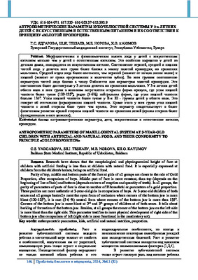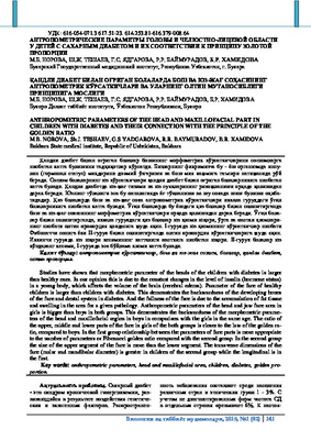 Исследования показали, что морфометрический показатель головы у детей с сахарным диабетом больше, чем у здоровых. По нашему мнению, это связано с постоянными изменениями уровня инсулина (гормонального статуса) в молодом организме, что влияет на объем головного мозга (отек головного мозга). Параметр лица здоровых детей больше, чем у детей с сахарным диабетом. Это свидетельствует об отсталости развития костей лица и зубочелюстной системы при сахарном диабете. А полнота лица обусловлена скоплением жировой ткани и припухлостью в области данной патологии. Антропометрические параметры головы и челюстно-лицевой области у девочек больше, чем у мальчиков в обеих группах. Это свидетельствует об отсталости морфометрических показателей головы и челюстно-лицевой области у мальчиков по сравнению с девочками того же возраста. Соотношение верхняя, средняя и нижняя части лица у девочек обеих групп ближе к закону золотого сечения по сравнению с мальчиками. В первой группе соотношение между параметрами частей лица больше соответствует количеству параметров или золотому сечению Фибоначчи по сравнению со второй группой. Во второй группе размеры верхнего сегмента лица больше, чем нижнего. Поперечные размеры лица (скуловой и нижнечелюстной диаметры) больше у детей второй группы, а продольные - у детей первой.