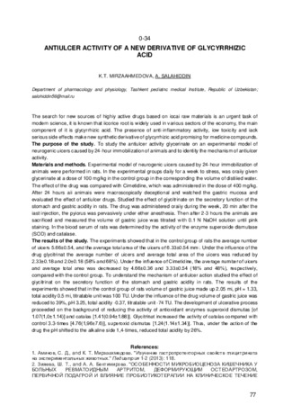 Поиск новых источников высокоактивных лекарственных средств на основе сырья иокаи является актуальной задачей современной науки, известно, что корень солодки широко используется в различных отраслях народного хозяйства, основным компонентом которого является глицирризиновая кислота. Наличие противовоспалительной активности, низкая токсичность и достаточно серьезные побочные эффекты делают новое синтетическое производное глицирризиновой кислоты перспективным для использования в медицине. Цель исследования. Изучить противоязвенную активность глицерина на экспериментальной модели нейрогенных высыпаний, вызванных 24-часовой иммобилизацией животных, и выявить механизм противоязвенной активности.