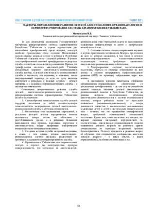 За два десятилетия реализации Государственной программы реформирования системы здравоохранения Республики Узбекистан в стране осуществлен ряд масштабных преобразований, среди которых, пожалуй, наиболее грандиозным стало создание Национальной модели охраны здоровья матери и ребенка в Республике Узбекистан «Здоровая мать – здоровый ребенок». В рамках этих преобразований заметной трансформации подверглась служба детской анестезиологии и реанимации. Причем эта трансформация оказалась многовекторной. Учитывая сателлитный характер анестезиолого-реанимационной службы вообще, и детской анестезиолого-реанимационной службы в частности, эти перемены, в основном, имели индуцированный характер, то есть, по сути, являлись адаптацией к реформам в базовых службах – детской хирургии, а с созданием перинатологической службы - и акушерства-гинекологии.