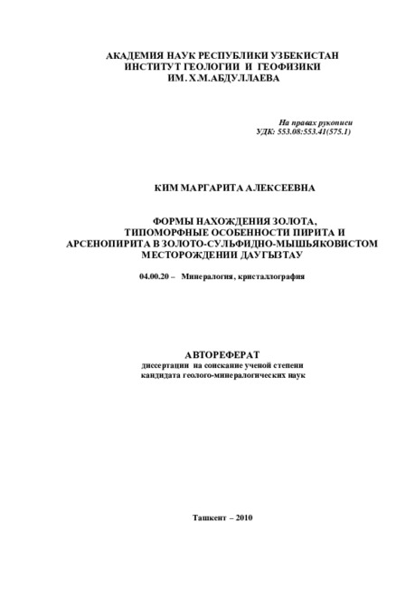 Объект исследования: золото-сульфидно-мышьяковистое месторождение Даугызтау в Западном Узбекистане.