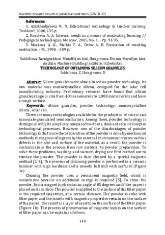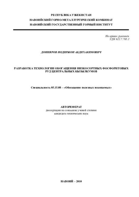 Практическая значимость: На основе проведенных исследований и полупромышленных испытаний разработана комбинированная технология обогащения низкосортных фосфоритовых руд Джерой-Сардаринского месторождения, позволяющая повысить содержание Р2О5 от 14,8% в руде до 27-28% Р2О5 в концентрате, а также снизить кальциевый модуль с 2,48 до 1,85.