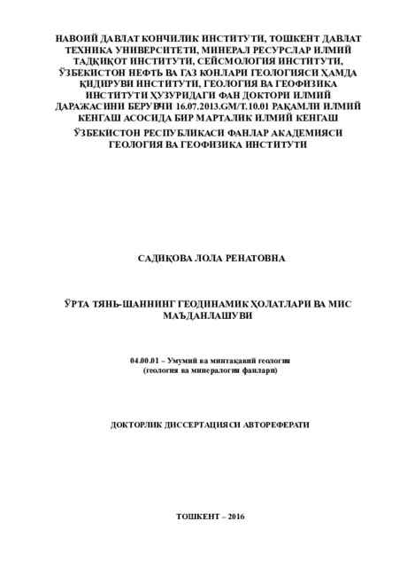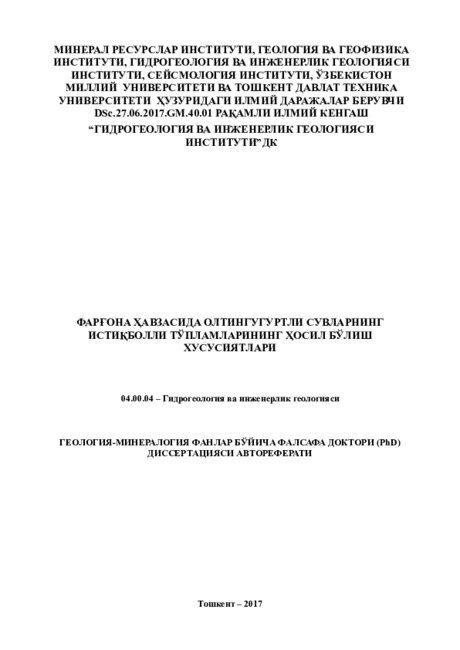 Данное диссертационное исследование в определенной степени служит выполнению задач, предусмотренных в Постановлении Президента Республики Узбекистан № ПП-1396 от 27 августа 2010 г. «О мерах по дальнейшему повышению эффективности системы организации и проведения геолого-разведочных работ», а также в других нормативноправовых документах, принятых в данной сфере.
