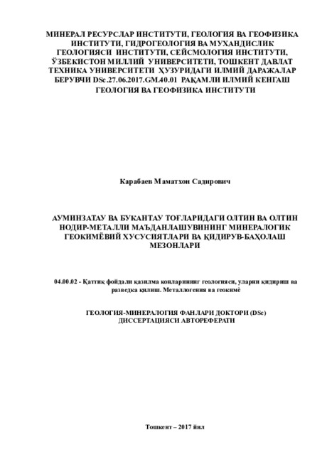На основе проведённых исследований в докторской диссертации на тему Минералого-геохимические особенности золотого и золото редкометалльного оруденения гор Ауминзатау и Букантау и поисковооценочные критерии» сделаны следующие выводы: